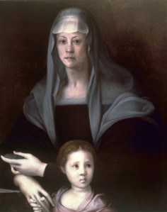 Pontormo (called by the name of his birthplace) was esteemed by the Medicis for his ability to capture the individuality of his sitters, while emphasizing their aristocratic demeanor. Maria Salviati was the wife of famous military leader Giovanni delle Bande Nere de’ Medici (d. 1526) and the mother of Cosimo I (1519-1574), grand duke of Tuscany. The little girl holding her hand here is probably Giulia, a Medici relative who was left in Maria’s care after the murder of the child’s father, Duke Alessandro de’ Medici (1511-1537). As Alessandro was born of a liaison between a Medici cardinal and a servant who, tradition has it, was African, this formal portrait may be the first of a girl of African ancestry in European art. The child was painted over sometime during the 19th century but was rediscovered during a 1937 cleaning of the work.