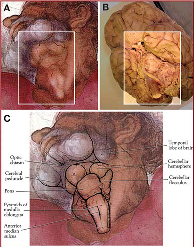 God, clothed in flowing red robes, is viewed from below and foreshortened, and seems to be rising into the sky. His arms are raised above his head, and he faces up and to his right, exposing his neck and the underside of a short beard. It is here that the study’s authors, the medical illustrator Ian Suk and Dr. Rafael J. Tamargo, a neurosurgeon, believe that Michelangelo concealed a drawing of the underside of the brain and the brain stem, with parts of the temporal lobe, the medulla, the pons and other structures clearly drawn.