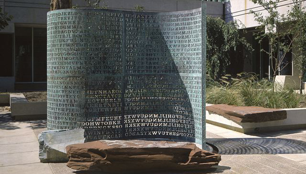 WASHINGTON, D.C.— For the small but maniacally devoted art-and-cryptography community, this was a landmark weekend, as artist Jim Sanborn took to the New York Times to throw a bone to codebreakers looking to unlock the riddle of his 1990 sculpture for the CIA‘s headquarters, “Kryptos.” The outdoor installation, located in the agency’s courtyard, consists mainly of a curving copper plate inscribed with some 1,735 characters, which contain no less than four encrypted messages. The first three were cracked by a CIA physicist in 1998. The mysterious “Panel 4,” designed to be especially difficult to crack, has continued to stymie sleuths. Sanborn, apparently growing weary of fans confronting him with false solutions to the 20-year-old puzzle, has decided to push the process along by offering a hint.