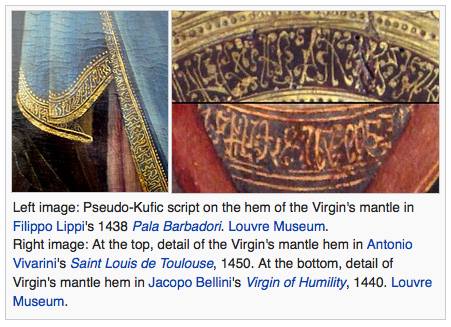 I find this fascinating.These are decorative imitations of an Arabic script used to represent opulence and and rarity.